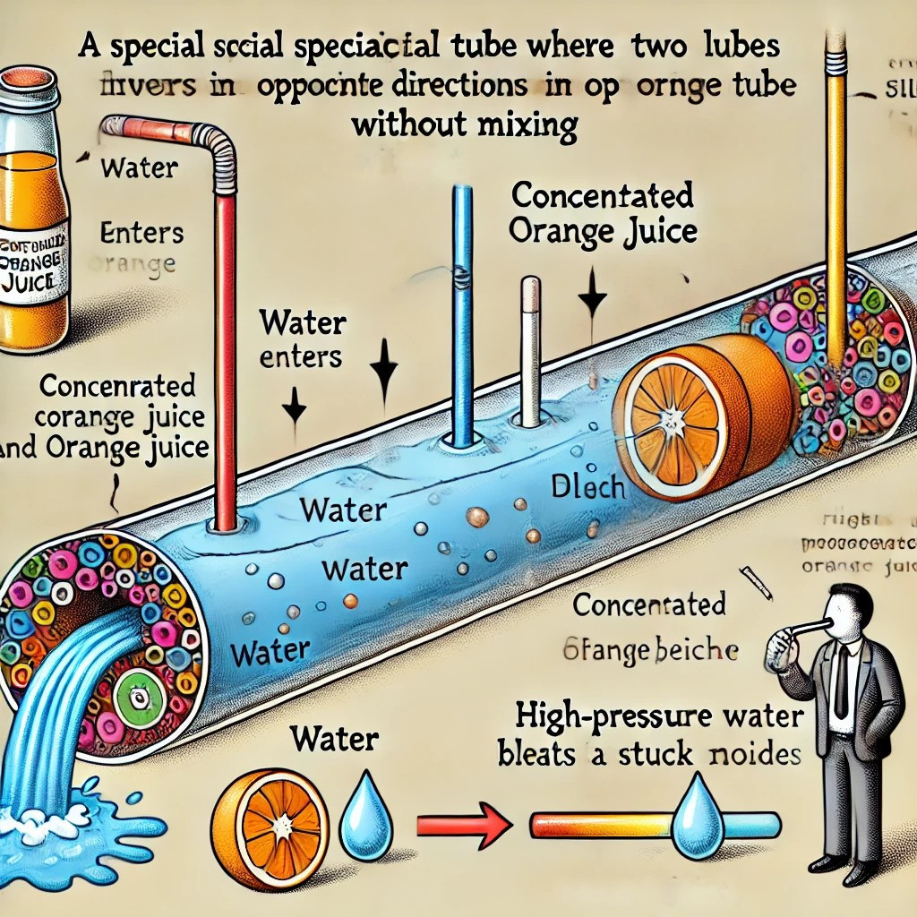 Here’s the analogy I like to use: I have a special tube that allows two liquids to flow in opposite directions without having them mix, as long as there is a constant flowrate through the tube. One end of my tube is connected to a water source, and there’s a branch breaking off from this end where I can sip from a straw connected to the line. The other end of my tube has a can of concentrated orange juice, such that water will flow down through the tube, dilute some of the concentrate, and then the diluted orange juice flows back up the tube so I can drink it with my straw.