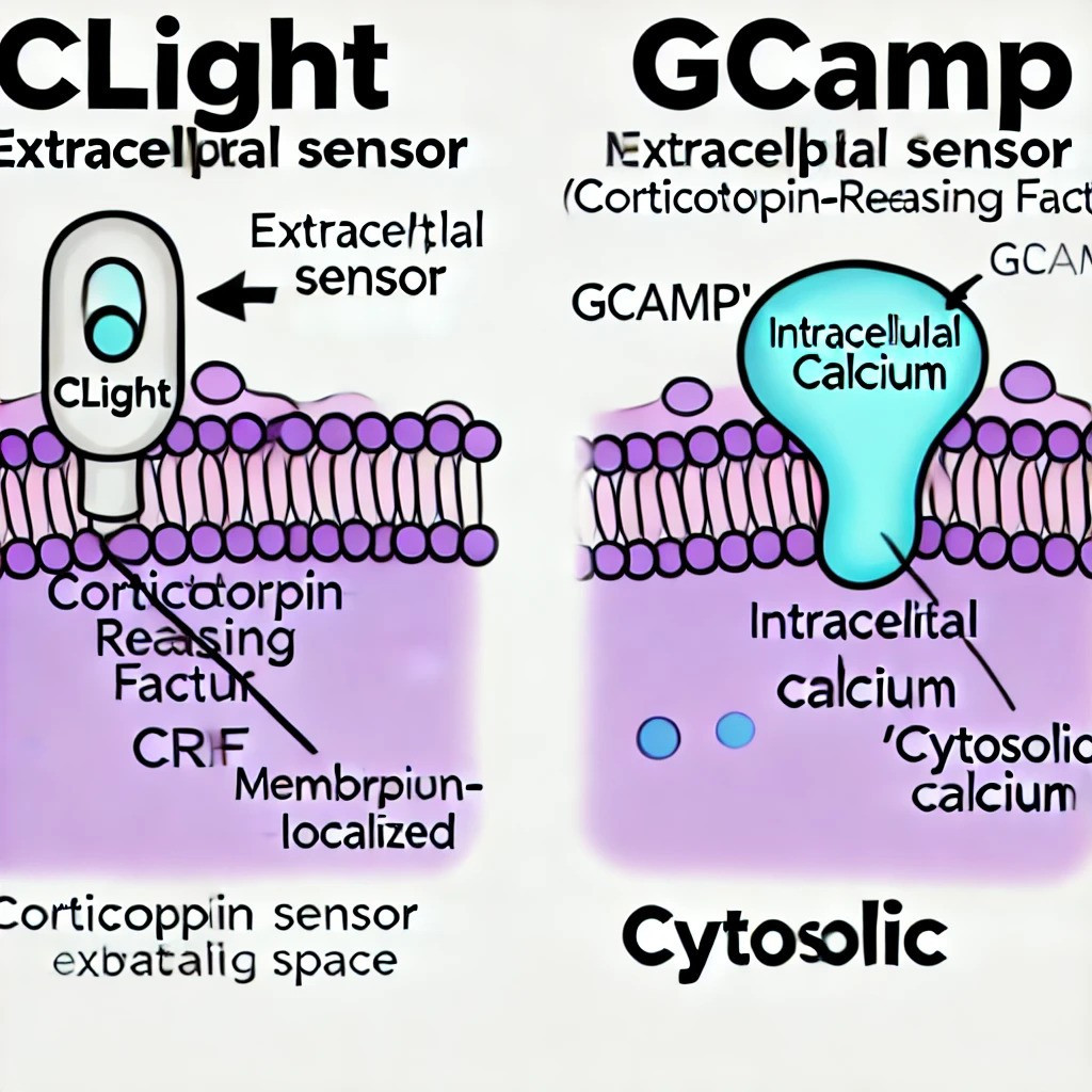 GPCR-based sensors, like cLight, are more sensitive to baseline concentration changes compared to GCaMP because calcium levels remain relatively stable over time. Activities that cause stress increase CRF levels, and since cLight is expressed on the cell membrane, it continuously detects CRF as long as it’s present in the extracellular space. In contrast, GCaMP, expressed in the cytosol, responds to calcium, which stays within a specific range during the action potential cycle, making it less prone to baseline fluctuations.